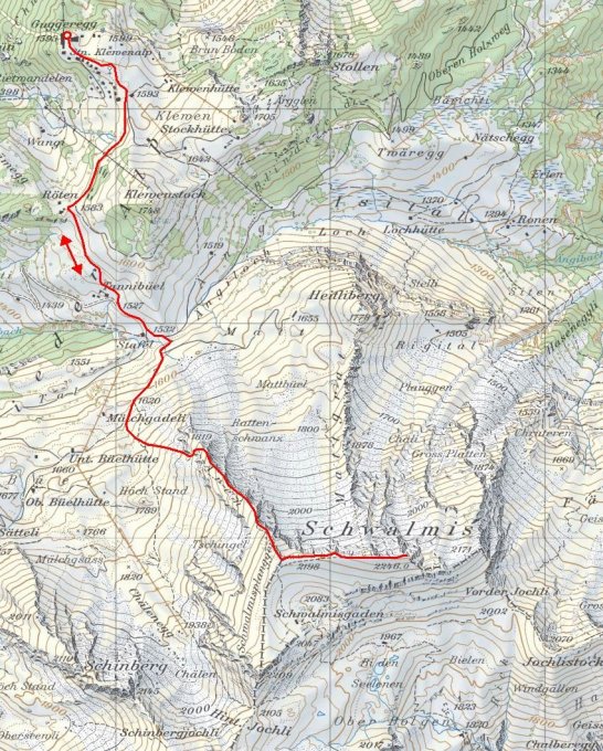 Ausgangspunkt ist die Klewenalp. Man folgt dem Winterwanderweg um den Klewenstock herum bis man zur Skipiste im Sattel 1532m beim der Alp Sattel kommt. Hier steigt man die Skipiste hoch bis etwa 100m nach der Querung des Sesselliftes. Ab hier ist Schneeschuhgelände und man sieht die Schwachstelle vom Arengrat durch die man zum Grat hochsteigen kann (dort wo die unterste Lawinensprengbahn endet, orange Kugel). Das Gelände wird gegen den Grat hin immer steiler, eventuell ist es einfacher zu Fuss über die steile Grasflanke zu steigen (heikel und brüchig ; T6; Fels bis I). Hat man den Grat erreicht ist die Tour einfach, man steigt auf dem schönen Arengrat bis zu dessen Ende beim P.2198m. Von dort leitet der fast ebene Westgrat zum höchsten Punkt.