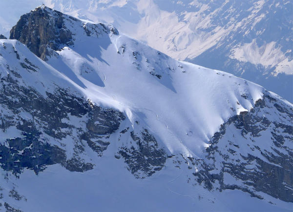 Abfahrt via Nordostwand: Vom Gipfel ca. 50m die Aufstiegsroute zurück, Einstieg auf ca. 5m 45-50° steil, dann vorsichtig am Rande der Gipfelschneefeldes vorbei (30 - 40°. Achtung: Triebschnee!) und auf den Grat in der Mitte der Wand zuhalten. Diesen bis fast(!) zum Ende fahren (Absturzgefahr!), bis rechts die Steilstufe (auf ca. 5-10 m 50-60°) sichbar wird. Auf ca. 5 Meter extrem steil zwischen Felsen hindurch (knapp 1 Skilänge Platz) dann den ca. 45° steilen Hang unterhalb ausfahren.