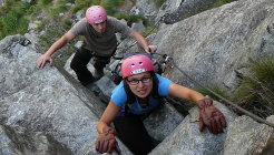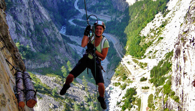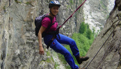 Für die sehr kurze Tyrolienne ist eine Rolle nicht unbedingt notwendig. Man kann sich auch mit einer kurzen Bandschlinge rüberhangeln.