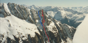 Rechts gehts direkt entlang der Salbit Westgrattürme. 100m Weiter bis zur Steilstufe mit Eisfall. 60m Kletterei WI3-4, M4-5. Oben Stand links im Eis, oder noch 15m weiter rechts zu Stand an Schlaghaken mit grüner Schlinge. Von dort Bootpack 450 Hm erst 45° dann 50°. Die letzten 50m bis zur Scharte sind zu eng zum Fahren, Skidepot. Von der Scharte 20m Kombigelände zur Gipfelnadel. Abfahrt wie Aufstieg . Einmal 5m abklettern. Abseilen 1x 50 vom Stand, 1x 30m von Zacken.
