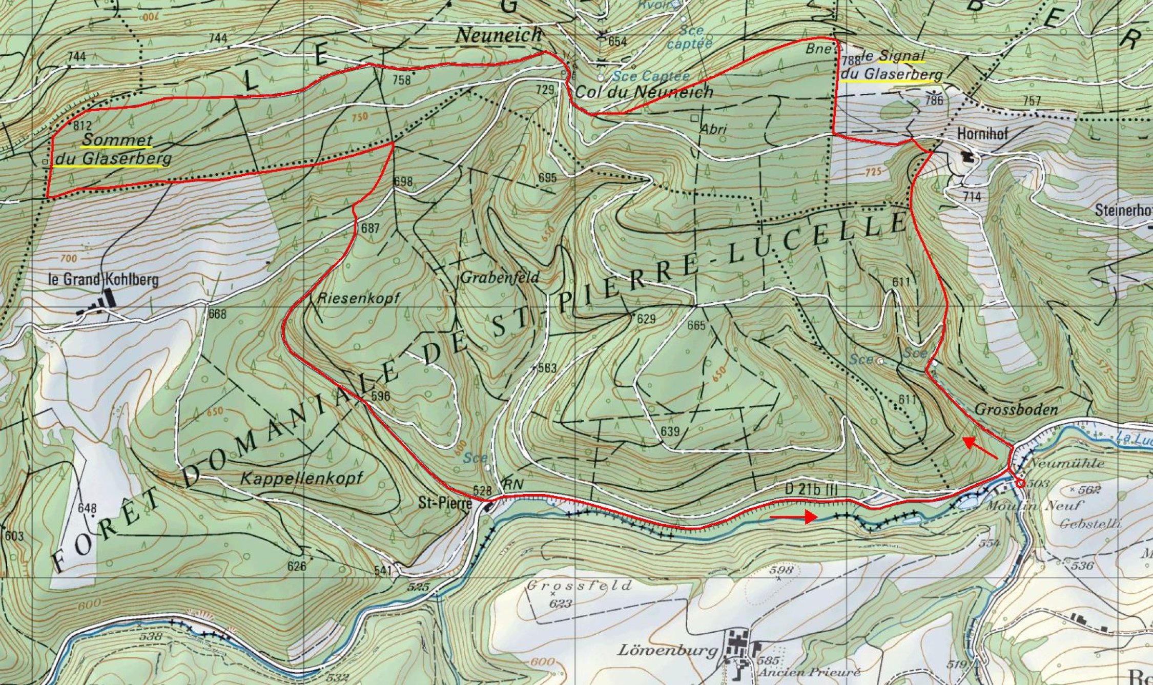 Von der Busendstation Neumühle (Moulin Neuf; Endstation der Buslinie ab Laufen nach Roggenburg) gelangt man in wenigen Schritten über den Bach La Lucelle nach Frankreich. Man folgt kurz der Strasse um dann in einem Tälchen aufzusteigen, allerdings wird der Weg dort immer schlechter. Oberhalb vom Hornihof gelangt man über eine Weide und dann dem Waldrand entlang zum Gipfelchen "Le Signal du Glaserberg" (788m). Vom kleinen Gipfel wandert man weiter über den markierten Wanderweg zum Col du Neunreich. Hier gibt's einen Parkplatz, Grillstellen, ein Schutzhüschen und einen Aussichtsplatz wo man bei schönem Wetter in die Rheinebene blicken kann... Vom Col du Neunreich setzt sich der markierte Wanderweg leicht ansteigend bis zum bewaldeten Sommet du Glaserberg fort. Der Gipfel trägt einen Grenzstein und daneben steht ein Wanderschild mit Höhenangabe. Um zum Ausgangspunkt der Tour zu gelangen, kann man am schnellsten über Forstwege nach St-Pierre (Hofgut) absteigen. Hier folgt man der Strasse der La Luselle entlang zur Neumühle.