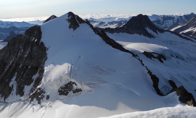 Vom Wettersattel über Firnhänge nach Osten empor. Am Schluss auf den Westgrat aussteigen und über diesen zum Gipfel.