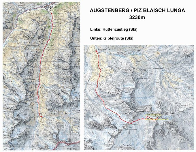 Die Route von der Hütte auf den Gipfel ist ziemlich einfach. Man folgt etwa dem Sommerweg über P.2353m und unterhalb P.2413m vorbei bis zur deutlichen Moräne westlich P.2606m. Danach betritt man den Chalausferner und steigt auf ihm, sich eher am östlichen Rand haltend, zur Fuorcla Chalaus (3004m) auf. Auf den letzten felsigen Meter in die Lücke müssen die Ski kurz getragen werden, richtig klettern muss man aber nicht (Schwierigkeit I im Sommer). In der Fuorcla Chalaus wendet man sich nach Osten und fährt wenige Meter ab bis unter eine Grosse Wechte. Die Wechte lässt sich an dessen nördlichen Ende unter dem Felsgrat mit Skis besteigen; oben hat man dann eine schöne Sicht auf den Augstenberg mit seinem perfekten Ski-Gipfelhang. Allerdings muss man von der Wechte zuerst nochmals 50 Höhenmeter ins Firnbechen Vom Vadret da Chalaus abfahren. Der Gipfelhang wird bis zur Lücke zwischen den beiden Augstenberggipfel immer steiler (zuletzt 30-35°) und die letzten Meter muss man zu Fuss aufsteigen. Von der Lücke ist der Hautgipfel dann in wenigen Minuten zu Fuss ohne Schwierigkeiten zu erreichen.