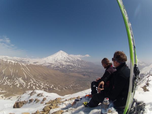Von der Verbindungsstraße Rhineh--> Polur geht es rechts eine Schotterpiste rauf zur Moschee Goosfand Sara (3000m). Diese Straße kann man zur Skisaison nur kurz mit dem Auto befahren(bis ca. 2600m), dann heißt es, die Ski kurz tragen und die nächste Rinne suchen, die möglichst ohne Unterbrechungen zur bereits von der Moschee sichtbaren Hütte "Bargah e Sevom" auf 4200m führt. Von hier kurz flach zum "Einstieg" des recht steilen (ca.35°)Riesenhanges, den man in mühevollen Serpentinen etwas linkshaltend bis zum Skidepot verfolgt (ca. 5300m). Weiter mit Steigeisen in direkter Linie über Firn und Schotter (teils ca. 40°)nach oben bis in die Gipfelfelsen, die simpel zum Hauptgipfel leiten. Vorsicht auf die Schwefelwolken! Vor allem bei der großen direkt unterhalb des Gipfels sollte man auf den Wind achten!!Abfahrt wie Aufstieg. Skiabfahrt vom Gipfel 2012 möglich, aber die Ski haben dann schon ordentlich Steinkontakt. Der Riesenhang zur Hütte runter ist einfach nur GEIL! Abfahrt auf Schneeresten bis knapp über der Verbindungsstraße Rhineh-->Polur möglich. GPS nicht vergessen. (GPS Track unter GPS-tracks.com, danke Andi Riessner!)