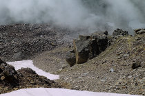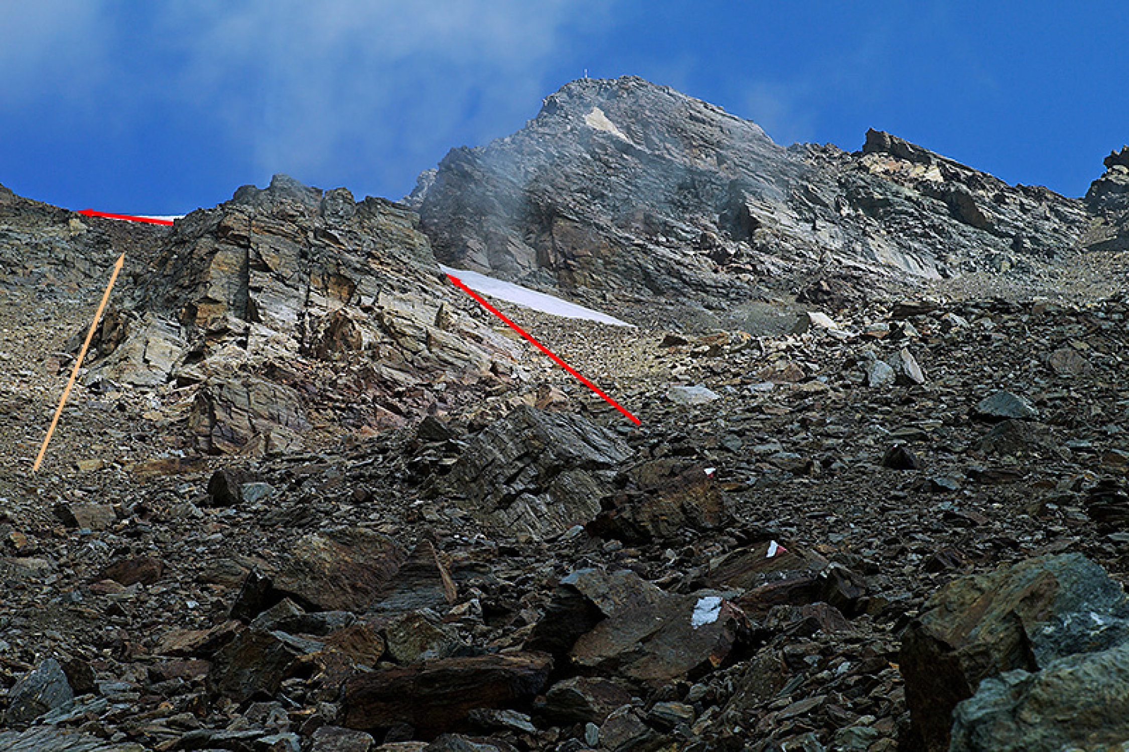 Der Originalaufstieg zieht rechts eines Felsbollwerks eine ostseitig verlaufende, gerne bis in den Spätsommer schneegefüllte Steilrinne hoch. Bei Hartschnee können hier Steigeisen unumgänglich werden.