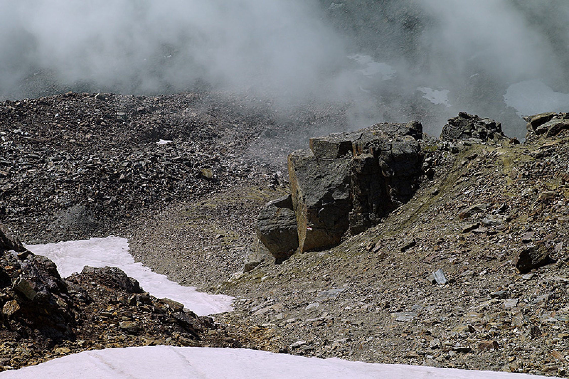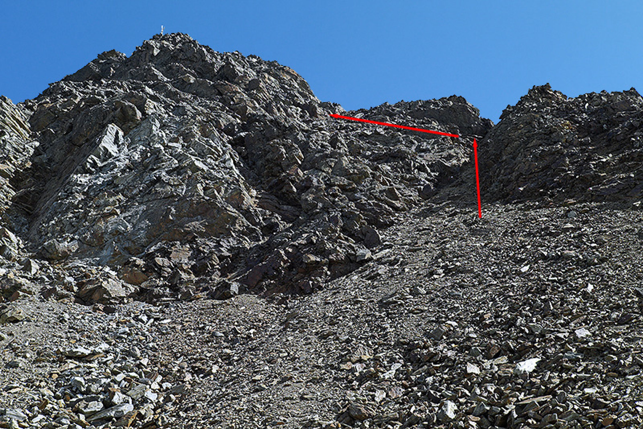 Der Sattel lässt sich auch links des Felsbollwerks in allerdings unsäglich mühsamem Schuttaufstieg erreichen. Da diese Flanke südseitig verläuft, ist sie viel früher im Jahr schneefrei als die markierte Route.