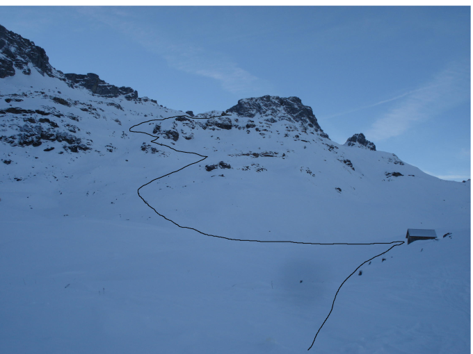 Erfolgt entlang der Aufstiegsspur oder – bei sicheren Verhältnissen – westlich des Munggenbandes als schöne Variante.