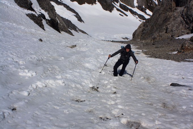 Pickel und Steigeisen bei Schneeauflage im Zustieg. Ein Seil ist für trittsichere Berggänger nicht nötig.