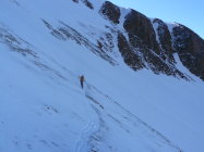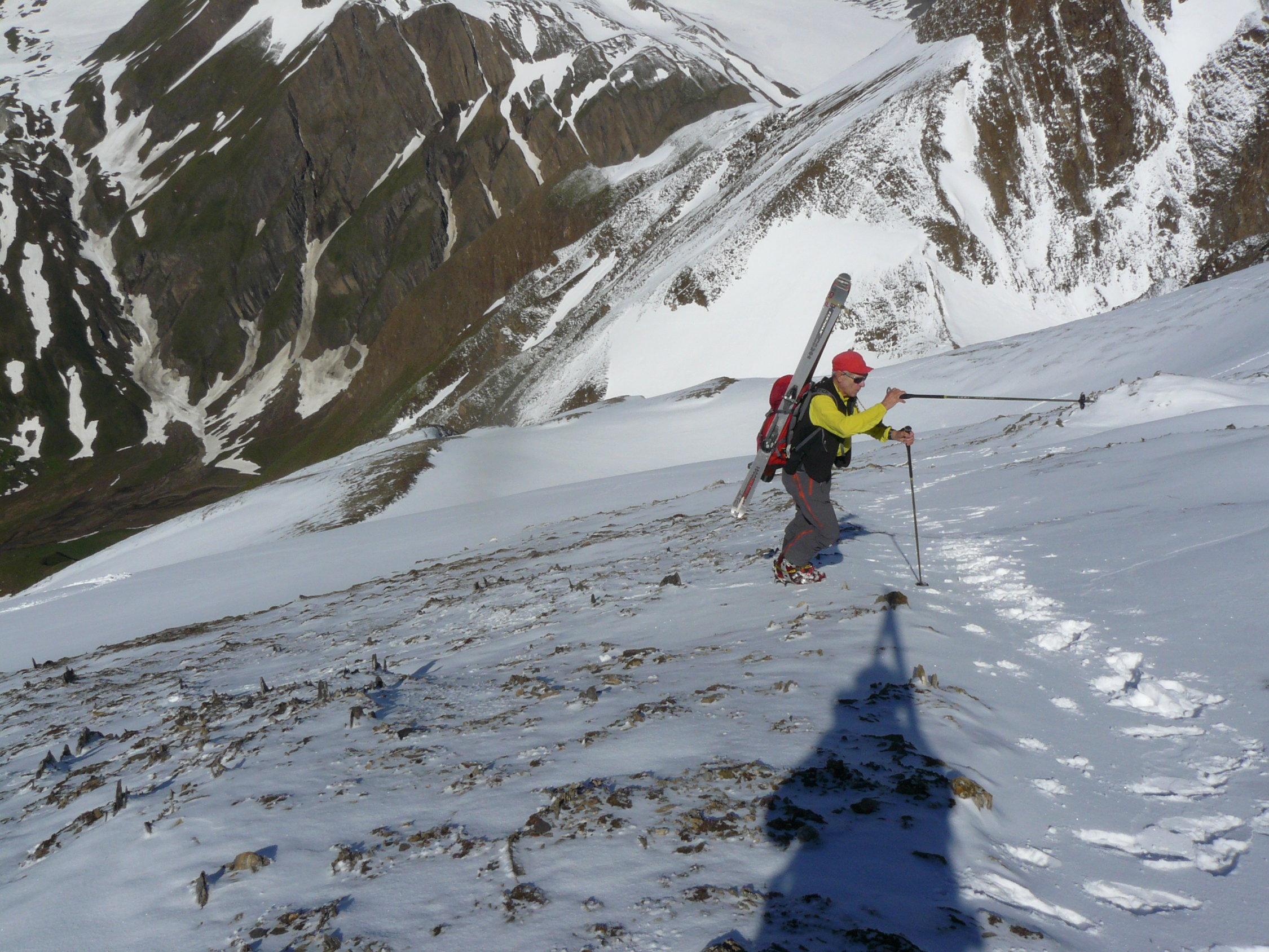 Für den steilen Gipfelhang bei sehr harten Verhältnissen ev. Steigeisen im Aufstieg. Bei Firn Superhang mit Ski.