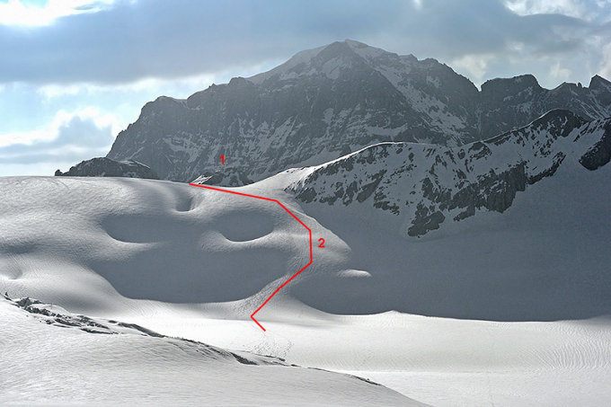 Ab 2800 Meter Höhe steilt die Südostflanke zunehmend auf und erreicht bis gegen 40 Grad. Sie ist aber bis zum Skidepot unterhalb des Gipfels auf ca. 3200 bis 3250 Meter Höhe sehr gut gangbar. Der Schlussaufstieg zum Gipfelkreuz erfolgt in einer knappen Viertelstunde über den zuletzt etwas exponierten Südgrat.