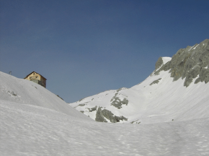 Vom P der Lünerseebahn (fühmorgens, lange bevor diese fährt) entweder dem Wanderweg mit aufgebundenen Schi folgend oder mit Schi an den Füßen steil über Firnfeld zum "Bösen Tritt" (Ketten, Wasser läuft über den Weg, evtl. Eis)und bald danach zum See (3/4 bis 1 Std.). Horizontal am See entlang nach W, bis der Wanderweg abzweigt und diesem wieder bis zum Schnee folgen oder bis zum W-Ende des Sees und in großer Mulde nach WNW unter die erst spät sichtbare Totalphütte (2-2,5 Std. evtl. Übernachtung im Winterraum). Nun entweder dem Weg in der LKS folgend li. hinauf an der Hütte vorbei und in großem, weit li. ausholenden Bogen über Rücken oder aber, die Hütte li. liegenlassend, direkt über große Rampe nach WNW unter den steilen felsigen S-Hängen hindurch (Lawinen!) zum steilen (~ 40°?) SSO-Hang hinauf, an dessen Ausstieg man die große Wanne erreicht, die im W vom Gipfelgrat begrenzt wird. Ausstieg auf den Gipfelgrat an geeigneter Stelle je nach Wechten, ebenfalls ~40°. Bei Ausstieg unterhalb des höchsten Punktes der Wanne lohnt es, die Schi bis zu deren höchsten Punkt mitzunehmen. Zum Gipfel noch wenige 100m meist zu Fuß.