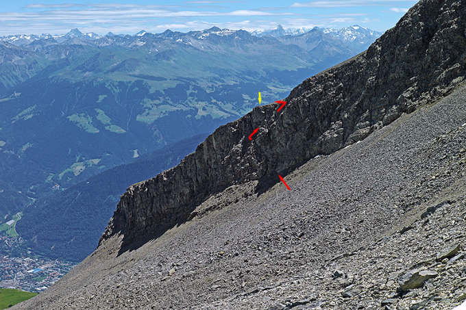 Man folgt hierzu im mühsamen Schutt der Wandstufe entlang abwärts steigend, bis nach etwa 250 Metern ein kleiner Steinmann oberhalb der Wandstufe (ca. 2600 m) den Durchstieg markiert.