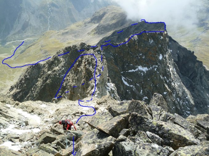 dem grat eher auf der rechten (o-seite) folgen. zuerst leicht. später mit ein paar kletterstellen den grat hinauf bis zum vorbau pkt. 3241.