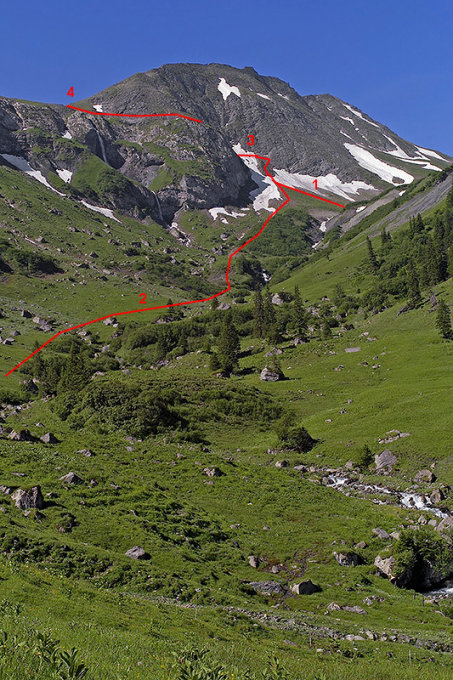 Bei Vorhandensein von Hartschnee ist die Querung jedoch äusserst heikel - nach durchschnittlichen Wintern sind dafür bis gegen Ende Juni meist zwingend Steigeisen erforderlich. Experimente sind hier tabu, jeder Rutscher endet unausweichlich den Gesetzen der Schwerkraft folgend 100 Meter tiefer im Geröll! Liegt Hartschnee, ist es deshalb meist sicherer, anstelle der Querung den gesamten Anstieg über die Rinne zu vollziehen.