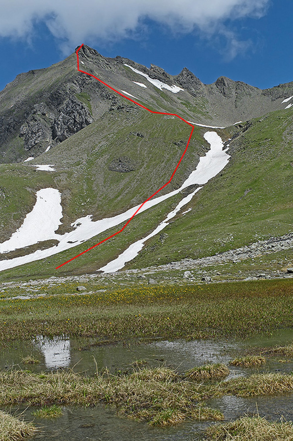 Im flachen, moorigen Talgrund des Ober Heubützli hält man sich ostwärts und steigt dem kleinen Wasserlauf folgend empor zum Seeauge auf etwa 2380 Meter Höhe.