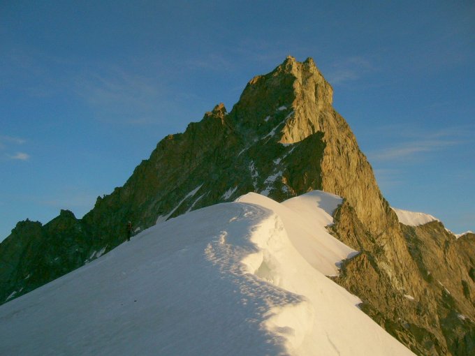 Von der Hütte in nördlicher Richtung unter dem Eseltschuggen durch bis zum Gletscherbeginn auf ca. 3330m. In nordöstlicher Richtung über den Gletscher bis zu einer Felsstufe durch welche ein Kamin auf einen breiten Blockrücken führt (Block mit Schlinge und Maillot). Auf dem Band in westlicher Richtung nur leicht ansteigend (Wegspuren/Firnfelder) auf den Felsrücken nördlich von Pt. 3551m. Diesen hinauf und ab 3700m ü. M. linkshaltend über einen Firnhang auf den Südostgrat. Am schmaler werdenden Grat über Firn zum Pt.3912m. Nun an Fels die erste Steilstufe am besten links umgehen und am schmalen Grat weiter. Vor der nächsten Stufe links in die Flanke queren zu dem markanten Couloir. Nun wegen Steinschlag besser an den linken Begrenzungsfelsen (III-; alle 25m Bohrhakenstände) vom Couloir kletternd zur markannten Scharte des Südwestgrates, rechts von einem zweigipfligen Gendarm (Gabel). Nun etwa 30m am Grat zum Absatz am Fuss eines Steilaufschwunges. Hier links durch einen Spalt absteigen zur Binerplatte. Am schrägen Riss (III; Bohrhaken) über diesen hinweg und an oder neben Felsrippe luftig hinauf zum Grat (III; Sicherungsstangen). Nach flachem Gratstück einen Gendarm links ausgesetzt queren zur Scharte vor dem Vorgipfel (Kanzel). Diesen rechts extrem luftig aber gutgriffig auf Band queren und über Platte (Normalhaken) und ein letztes Gratstück zum Gipfel.