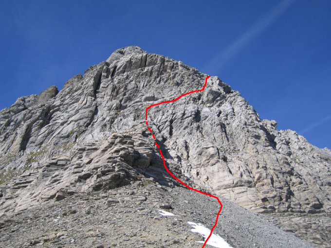 Weiter über die SE-Flanke zum Gipfel. Der Vorbau wird auf der rechten Seite auf Wegspuren umgangen. Nachher in ein enges Couloir hinein und dieses bis zu dessen Ende folgen (nicht vorher nach rechts in die Flanke hinein!). Nun in der Falllinie aufwärts bis man eine erste Kette erreicht. Nach dieser schon bald auf Wegspuren nach rechts queren und wieder hinauf.Gipfelaufbau Nun wird das Gelände einfacher aber auch sehr lose (Vorsicht auf nachfolgende Gruppen!!). Über Wegspuren hinauf bis man einen weiteren Felsaufschwung erreicht. In den markanten Einschnitt hinein zu einer zweiten Kette.Felseinschnitt Über diese hinauf (2 m) und weiter zur dritten Kette. Über diese in sehr speckigem Fels empor (5 m). Der letzte Aufschwung zum Gipfel wird auf dessen Südseite auf einem einfachen Band umgangen.
