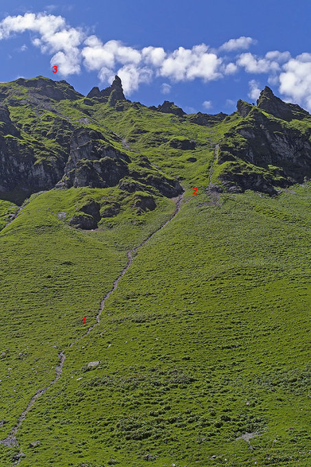 Hinweise: Im oberen Teil ist die Begehungsspur (Stand 2023) kaum mehr auszumachen und infolge Erosion teilweise auch nicht mehr vorhanden.