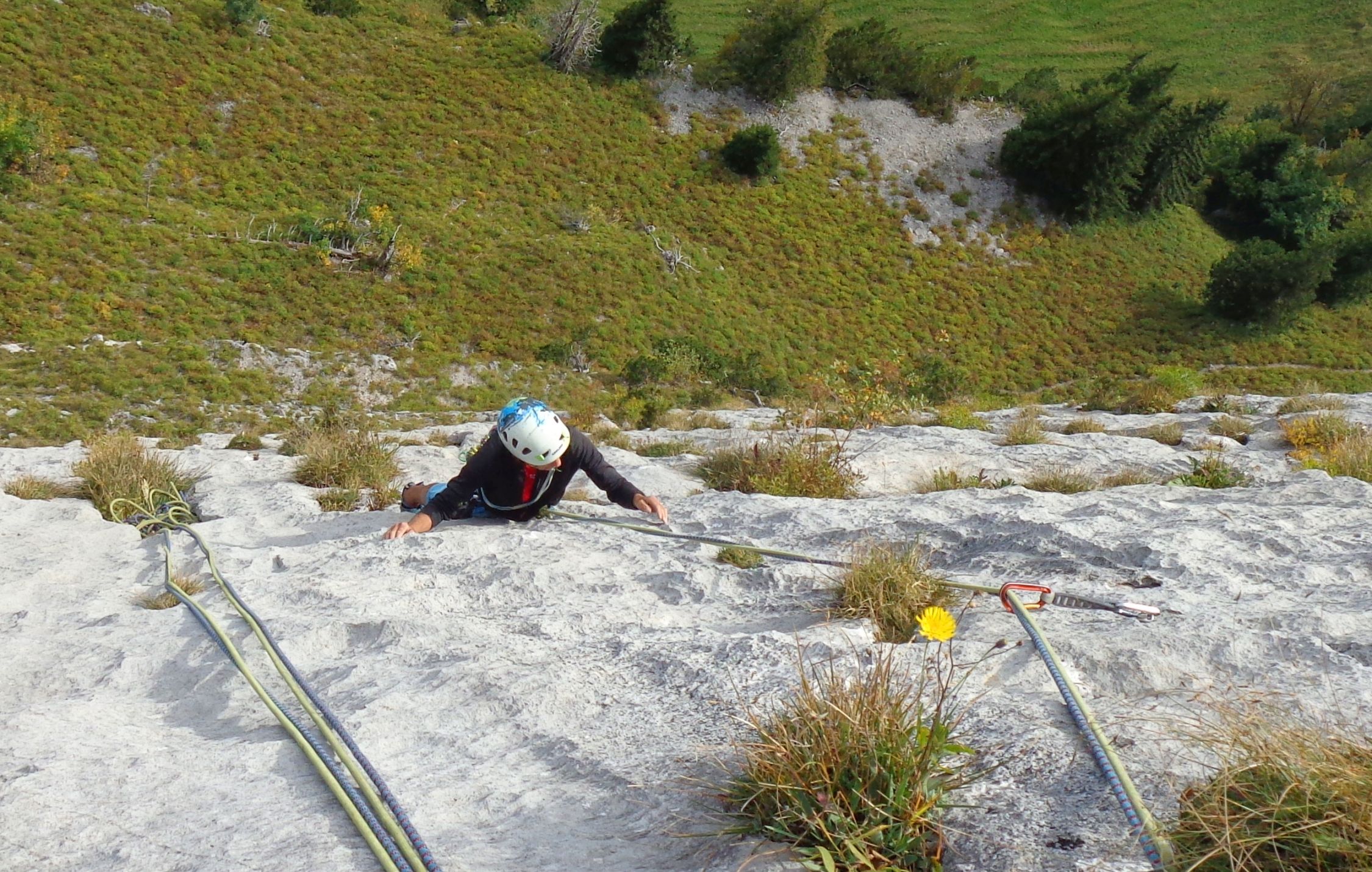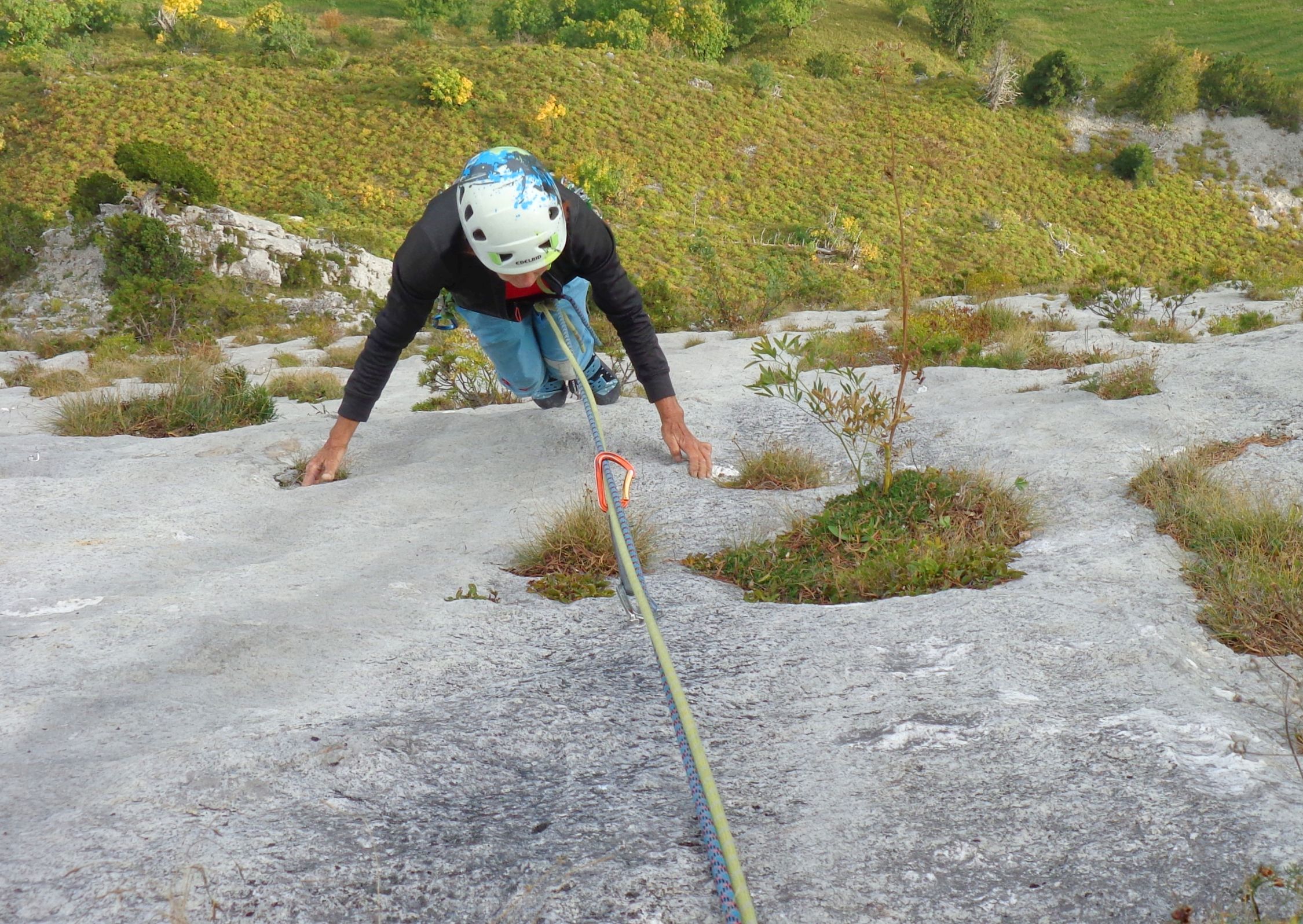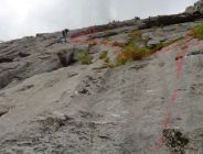 Es lohnt sich jeweils einen kleinen Satz Keile und Cams mitzunehmen (Keile vor allem zum Fädeln von Sanduhren). Insgesamt kann die Absicherung noch unter gut+ laufen (Maguggi und Katerbummel-Teil), aber: das ganze macht nur Spaß, wenn man den Grad auch 2 m über einem Bh einigermaßen beherrscht. Die Routenfindung ist nicht besonders schwierig, aber man sieht nicht immer direkt den nächsten Bh. Praktisch in allen Schlitzen und Löchern ist Botanik. Das stört nicht sonderlich (kann auch mal nützlich sein) solange es voll trocken ist und man keine schmierigen Sohlen bekommt. Der Einstieg ist klar durch eine Sanduhrschlinge markiert. Man steht da recht gut.