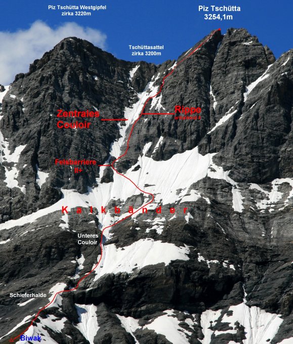 Vom gutem Biwakplatz P.2811m folgt man dem Rücken über die rutschige Schieferhalde zum Einstieg der Südwandroute. Der Eintieg ist eine Rechtsquerung über ein Schieferband der über die unterste Wandstufe leitet (T4). Nun steigt man über rutschiges Schiefergelände weiter nach rechts oben bis zum Beginn eines markanten Couloirs (T3-4) . Durch dieses geht's Couloir gut gestuft (T4+; Fels I) 30m nach oben bis man nach rechts auf eine Schutthalde hinausqueren kann. Über Schutt und plattige Felsen steigt man nun weiter nach rechts oben zu den auffälligen Kalkbänder (T5; Fels I). Die Kalkbarriere wird an der schmalsten Stelle leicht kletternd (I-II; T5) überwunden und man erreicht eine grosse Schuttterasse. Hier wendet man sich wieder nach Links und quert ansteigend den steilen, haltlosen Schutt (T4-5) bis zu den hellen Felsen unterhalb des zentralen Couloirs. Auf einem Band kann man die Felsstufen überwinden (T6 / II+) und gelangt so auf eine Anhöhe rechts über dem unteren Ende vom zentralen Couloir. Ab hier ist die Route durchgehend T6 und die Kletterei anhaltend II bis zum Gipfel. Man klettert direkt über die Rippe die das Couloir rechts begrenzt bis zu dessen Ende wobei der letzte Zacken rechts umgangen wird. Nach der Rippe wendet man sich etwas nach rechts und gelangt über brüchige, auffällig helle Kalkfelsen ins Gipfelcouloir. Durch dieses direkt, aber sehr heikel (brüchig und viel Schutt !) nach oben wobei man sich im unteren Teil eher an die rechten Begrenzungsfelsen hält. Von der Scharte am Ende des Gipfelcouloirs gelangt man über einfache Felsen auf den Gipfelzacken mit dem Vermessungspunkt. Hier ist allerdings die Tour noch lange nicht vorbei, denn Abstieg dauert wegen dem Gelände länger als der Aufstieg!