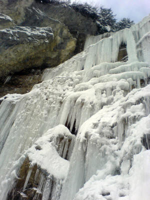 Je nach Seillänge kann der Eisfall in ein oder zwei Etappen (analog zur Stufung) durchstiegen werden, es gibt links in der Wand einen neuen Stand. Am Ausstieg existiert eine Abseilstelle an einem Baum (links).