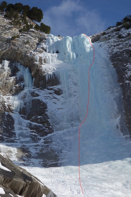 Thron (WI5+) umfasst ca. 280 Klettermeter, welche gewöhnlich in 5-6 SL beklettert werden. Die ersten 180m bieten gemässigtes Gelände (60-70 Grad), die Headwall ist nahezu senkrecht. Abstieg durch Abseilen an Abalakovs.