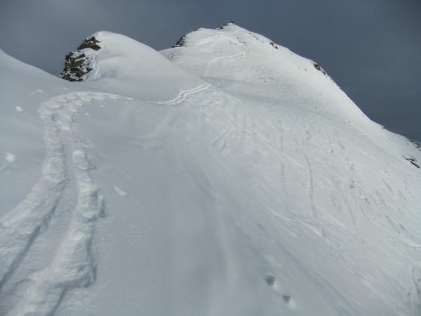Von hier beginnt aussichtsreicher, aber nicht extrem ausgesetzter Gratweg, der im Sommer als Golmer Höhenweg bis zur Geisspitze rot – weiß markiert ist. Auch im Winter ist die Orientierung trotz überschneiter Markierungen nicht schwierig. Immer auf dem Grat bleiben. Zuerst wird der Latschätzkopf (2219 m) erklommen. Dann hinab zum P2210 in 45 min. ab dem Golmer Joch. Dort zweigt der Weg ab direkt zum Hätaberger Joch und weiter zur Geisspitze (wird mit 45 min. im Sommer angegeben).