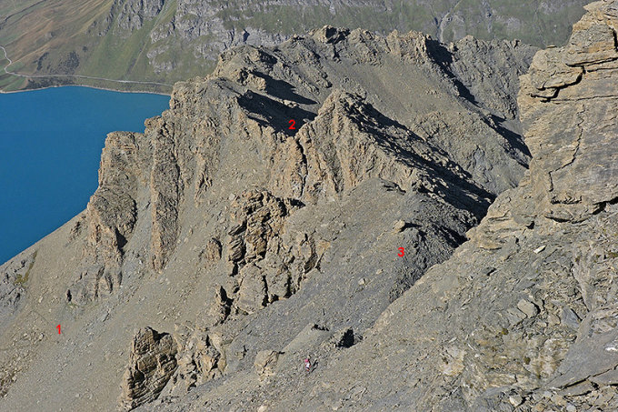 Vom Col du Lou (3042 m) folgt man dem Westsüdwestgrat, wobei man sich meist an dessen Nordseite hält. In die Südseite weicht man nur zweimal aus - im Mittelteil des Aufstiegs sowie am eigentlichen Gipfelkopf. Bei weiten Teilen des Aufstiegs handelt es sich um Gehgelände in allerdings brüchigen Schrofen und Geröll, immer wieder unterbrochen von leichter Kletterei bis etwa Schwierigkeitsgrad I+. Es finden sich nebst wenigen Steinmännchen kaum Begehungsspuren, die Route ist mit etwas Spürsinn und Aufmerksamkeit dennoch gut zu finden.