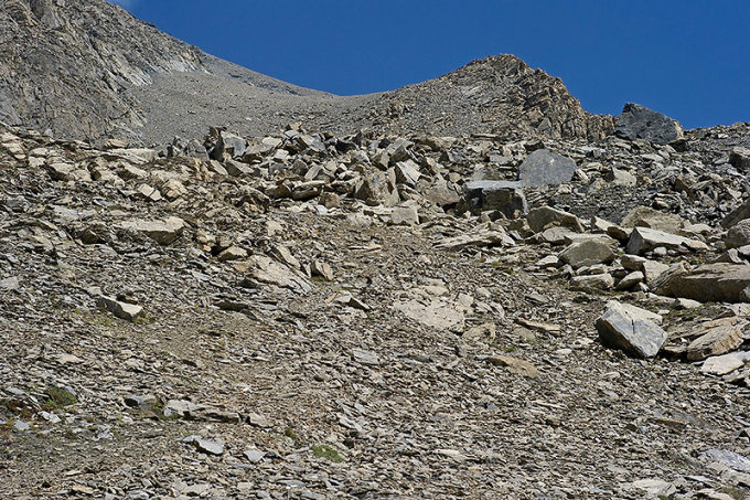 Ein gut sichtbarer Steig führt nun durch die mühsamen Schuttflanken der Südseite zum Sattel bei Punkt 3431 im Westgrat der Pointe du Lamet. Entlang des Westgrates erreicht man auf Pfadspuren problemlos den Gipfel.