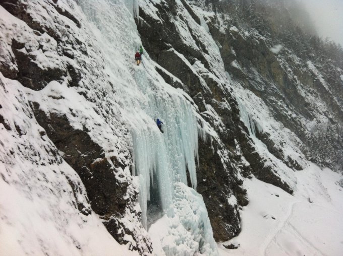 Rund 200 recht anhaltend steile Klettermeter, die in der Regel in 5-6 SL bewältigt werden. Maximale Schwierigkeit WI5+. Abstieg durch Abseilen.
