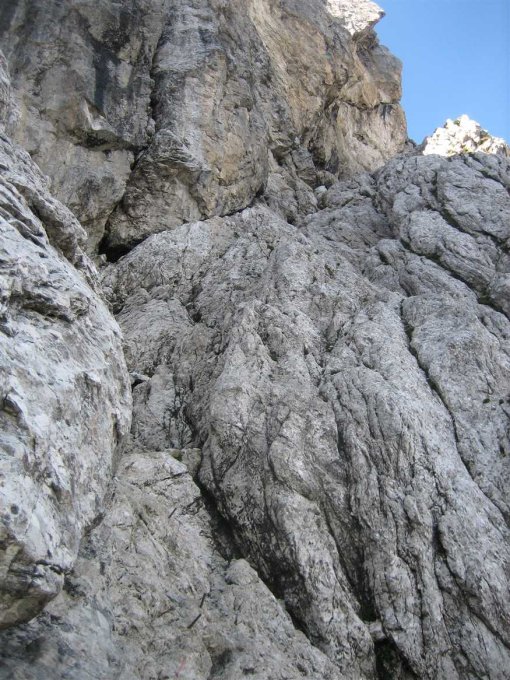 Im Vergleich mit "modernen Klettersteigen" weniger versichert, einige ungesicherte und ausgesetzte Passagen. Vom Einstieg in Rinnen empor, über Bänder und Platten im Zickzack zum Gipfelaufbau. Oberes Drittel der Route im ungesicherten 1er-Gelände, Markierung schon ziemlich verwaschen.
