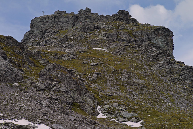 In der Südflanke finden sich problemlos zu begehende Grashänge vom Lavtinasattel empor bis an die wenig hohen Felsstufen am Gipfel.