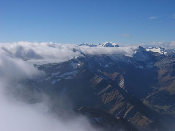 Am Anfang unter und in den Wolken, oberhalb Sardonapass frei, am Sardona-Gipfel freie Sicht von Tödi über Glärnisch, Bodensee bis zur Schesaplana, im Süden Wolkenwand und am Piz Segnas Nebel.