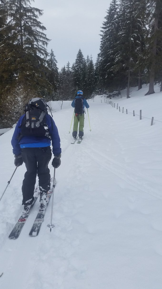 aufstieg super gespurt-merci.abfahrt über unsere Spezialroute rechts von gipfel und steil durchs bachtobel runter hengstschlund noch first.oberer teil etwas wind in pulver aber schön.einfahrt steilflanke in wald(-45°)vorsichtig von waldseite links her-aber top pulver -50cm und stabil-der hammer.unterster flankenteil in hengstschlund /-bach runter der obligate regendeckel aber fahrbar.