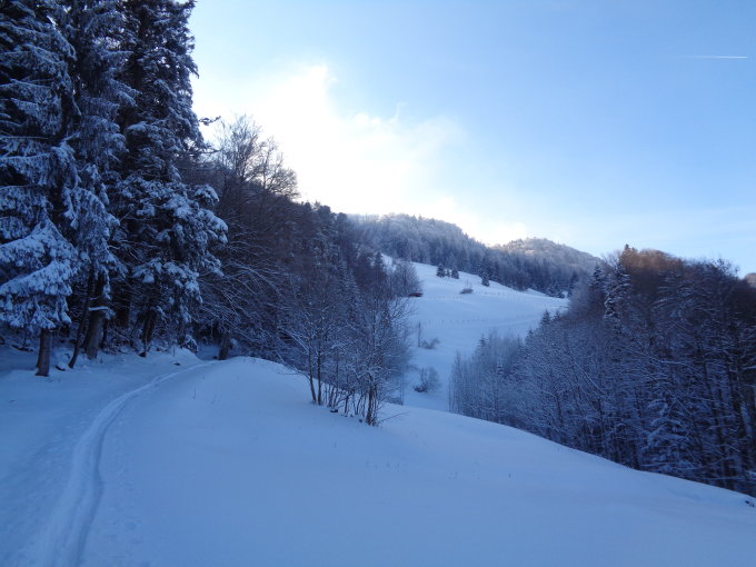 War schon lange nicht mehr so gut! Das sollte reichen... Ich zog vom Vogelberg noch runter zur Wasserfallen und rauf zum Chellenchöpfli. Chellenchöpfli hat noch viel Platz für neue Spuren wieder runter zur Wasserfallen. Dann streng rauf zum Vogelberg und zum Passwang. Abfahrt ins Bogental war eher na ja. Also wieder rauf zum Geitenberg und dann gerade runter. Da immer im Schatten waren die Schneeverhältnisse denn auch *****!