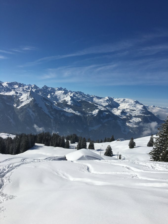 Viel Schnee in Illgau sicher ein Meter. Aufstieg der präparierten Abfahrtspiste (Gegenverkehr) entlang bis ca Ober Chruthütli. Von dort die direkte Aufstiegsspur durch den meterhochen Schnee bis Laucherenstöckli genommen. Abfahrt Super mann darf einfach nicht bremsen oder "bögele" und falls man den Chrampf bekommt kann man auf die Piste.