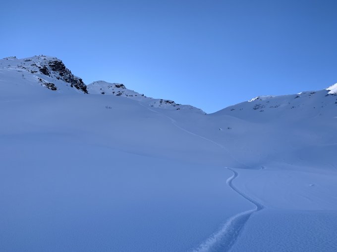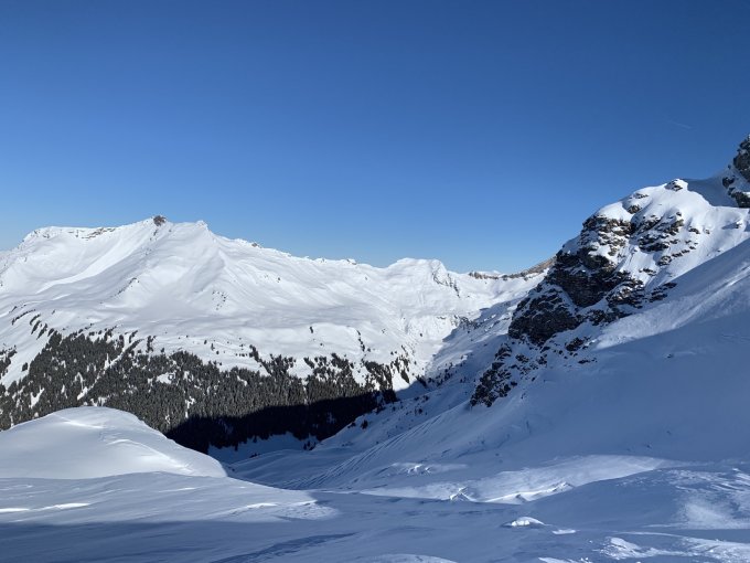 Pulverschnee von oben bis unten. Die alten Spuren in der Abfahrt nördlich nach Engi kaum zu spüren.