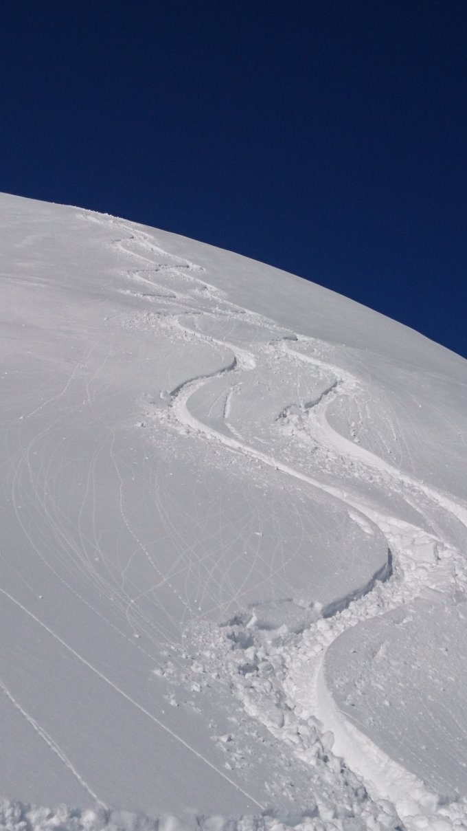 Abfahrt um 12:00 schon zu spät. Schnee praktisch überall zwar noch pulvrig aber bereits sehr feucht. Am besten in den östlichen Schattelagen.