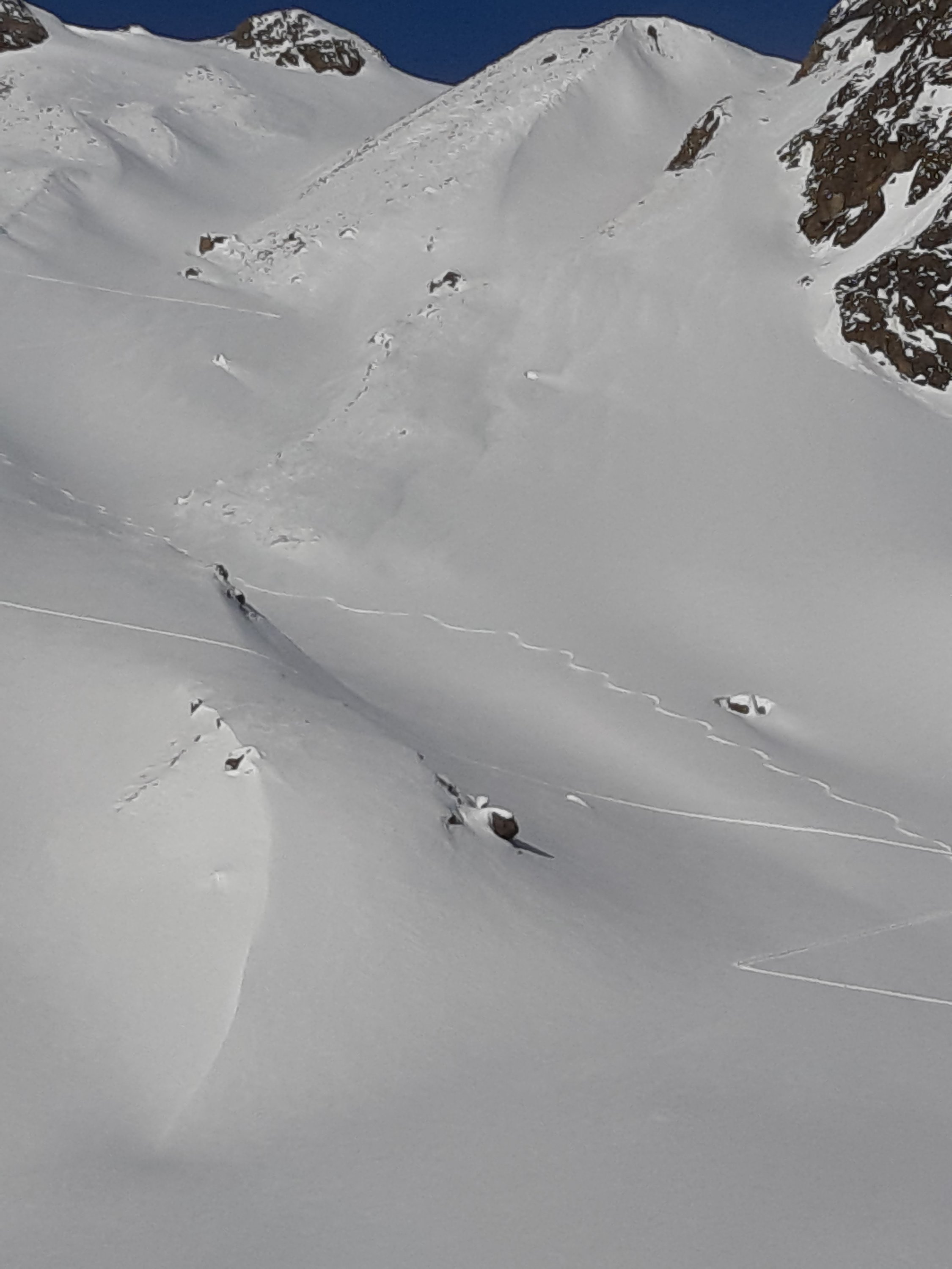 Sehr viel Schnee im Gebiet und die Verhältnisse machen einen sicheren Eindruck. Die leichte Kletterei zum Gipfel war heute gut ohne Steigeisen machbar. Ca die Hälfte der Abfahrt im tollen Pulverschnee, der Rest vom Wind bearbeitet, aber gut zu fahren.