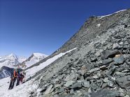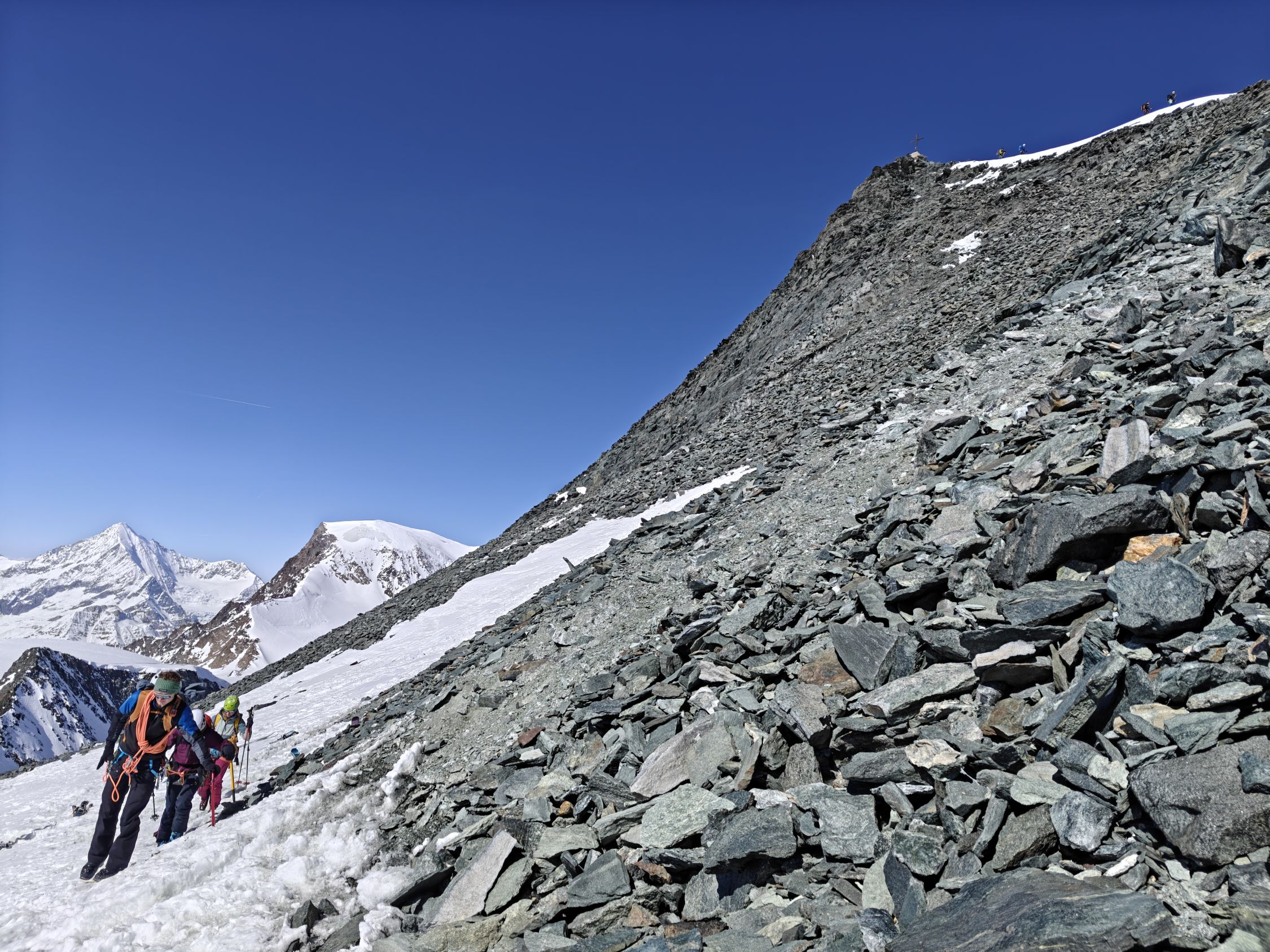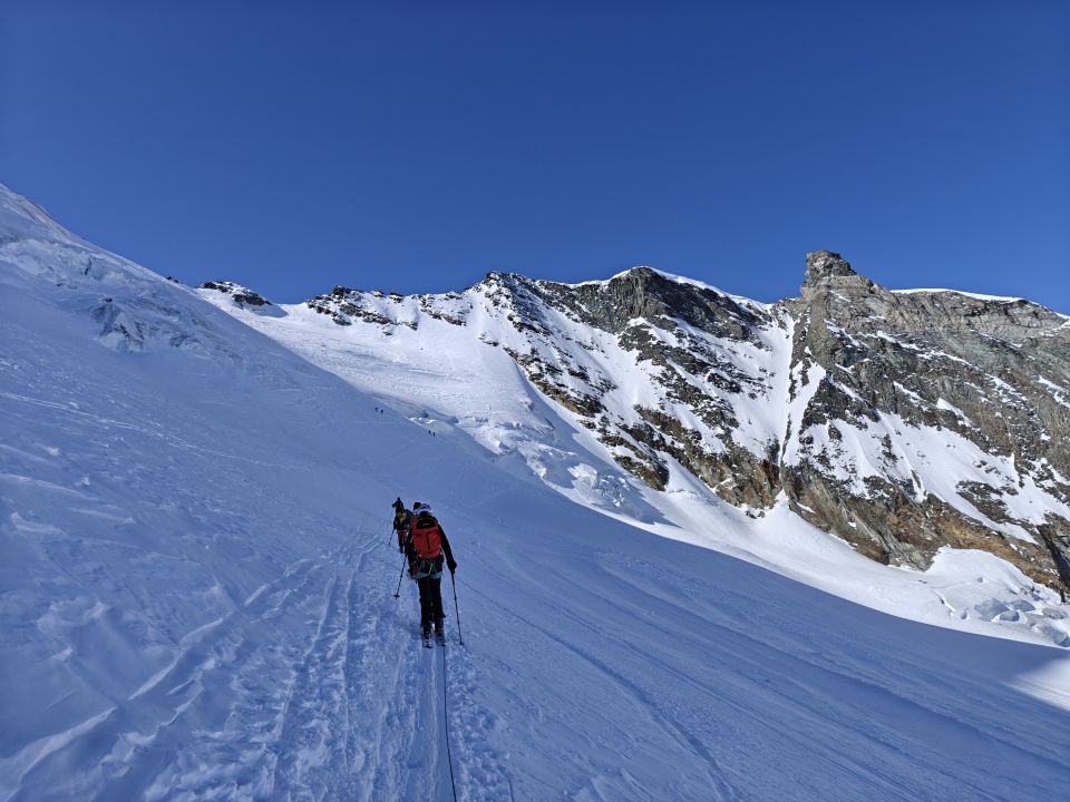 Aufgang mit guter Spur. Skidepot auf 3980m und Aufstieg ohne Steigeisen, es gab weing Schnee. Am Nachmittag war der Schnee auch für in die Abstieg hart.