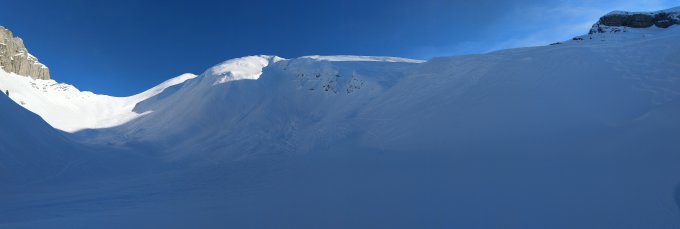 Abfahrt unter P. 2256 in gutem Pulver, hat einige Spuren. Einfahrt noch speziell mit Metallnetz, das durch den abgerutschten Schnee zum Vorschein kommt. Direkter übergang Glattegrat nicht gespurt, sieht auch nicht sehr einladend aus. Auch Abfahrer mit/ohne Gipfel in südwestflanken (unter schinberg jochli)