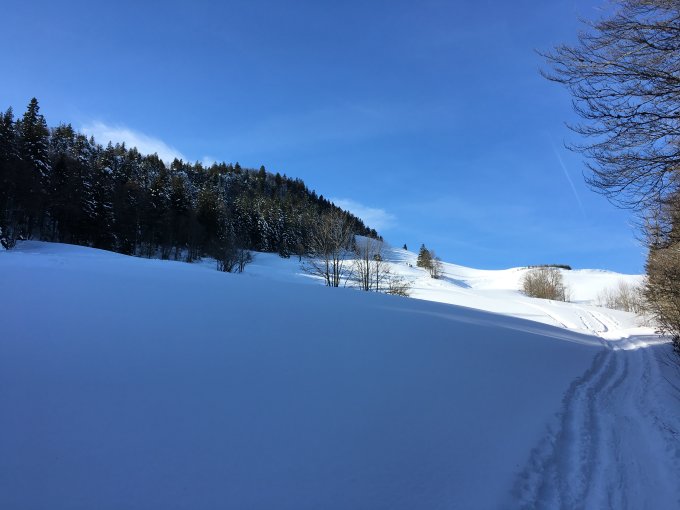 Ganze Region genügend Pulverschneeauflage. In der Abfahrt bereits stark verfahren. AUf der Strasse zurück zum Ausgangspunkt versteckte schwarz geräumte Strassenabschnitte, die spät erkannt werden.