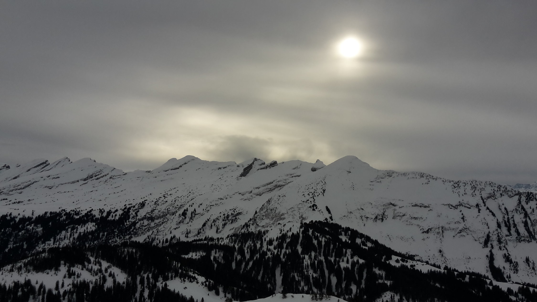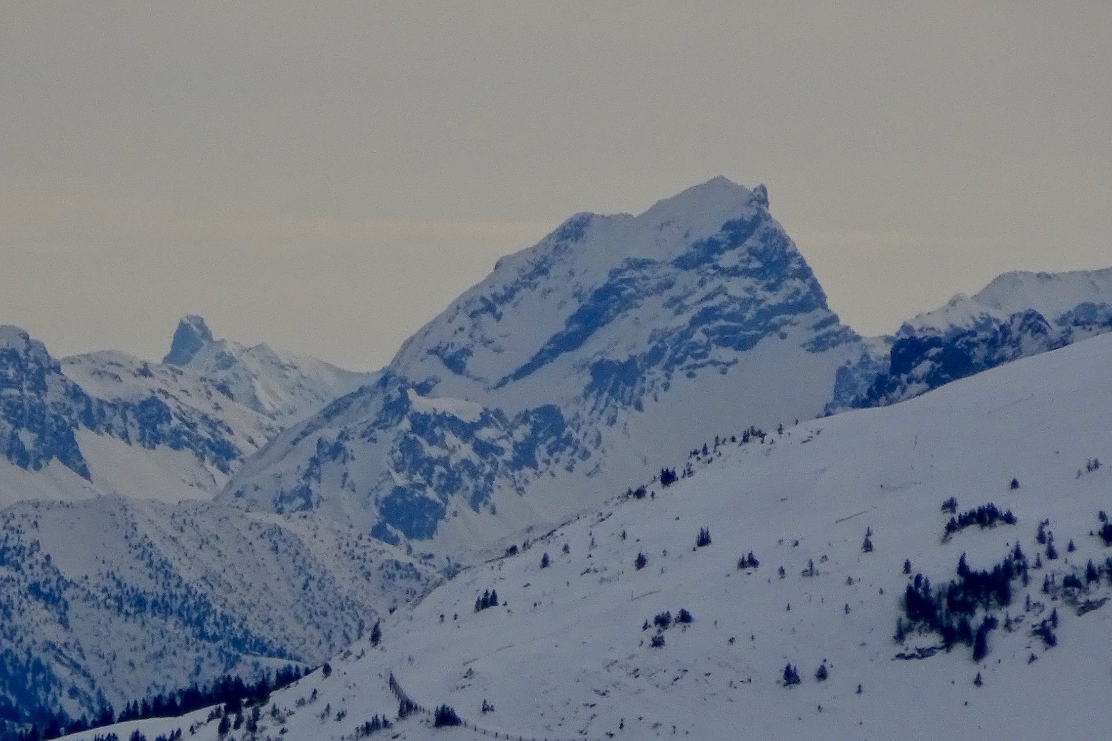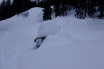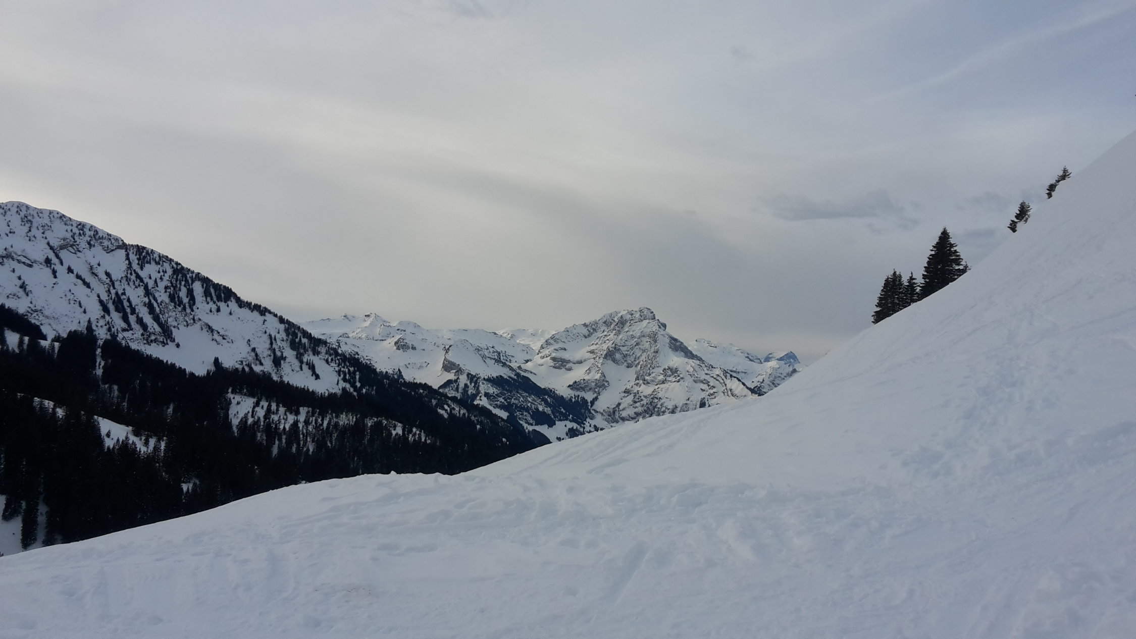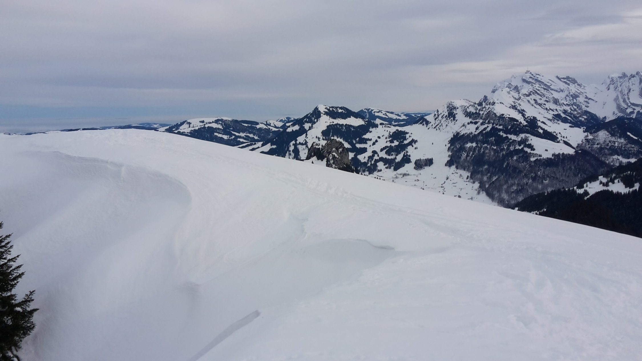 Aufstieg gut gespurt, die angetroffene Spur ist im Steilaufstieg zum Ostrücken lawinensicher direkt den Bäumchen nach gelegt. Abfahrt: Der Steilhang ist von einer Schmelzharschkruste geprägt, einzig nördlich von Baumbeständen sind noch Pulverschneetaschen vorhanden. Im mittleren Bereich bei Diggi hält man sich am besten nahe am Wald, der Schnee ist dort am weichsten, in den ehemals waldschattigen Partien der untersten 200 Höhenmeter ist sogar noch reiner Pulver zu geniessen.