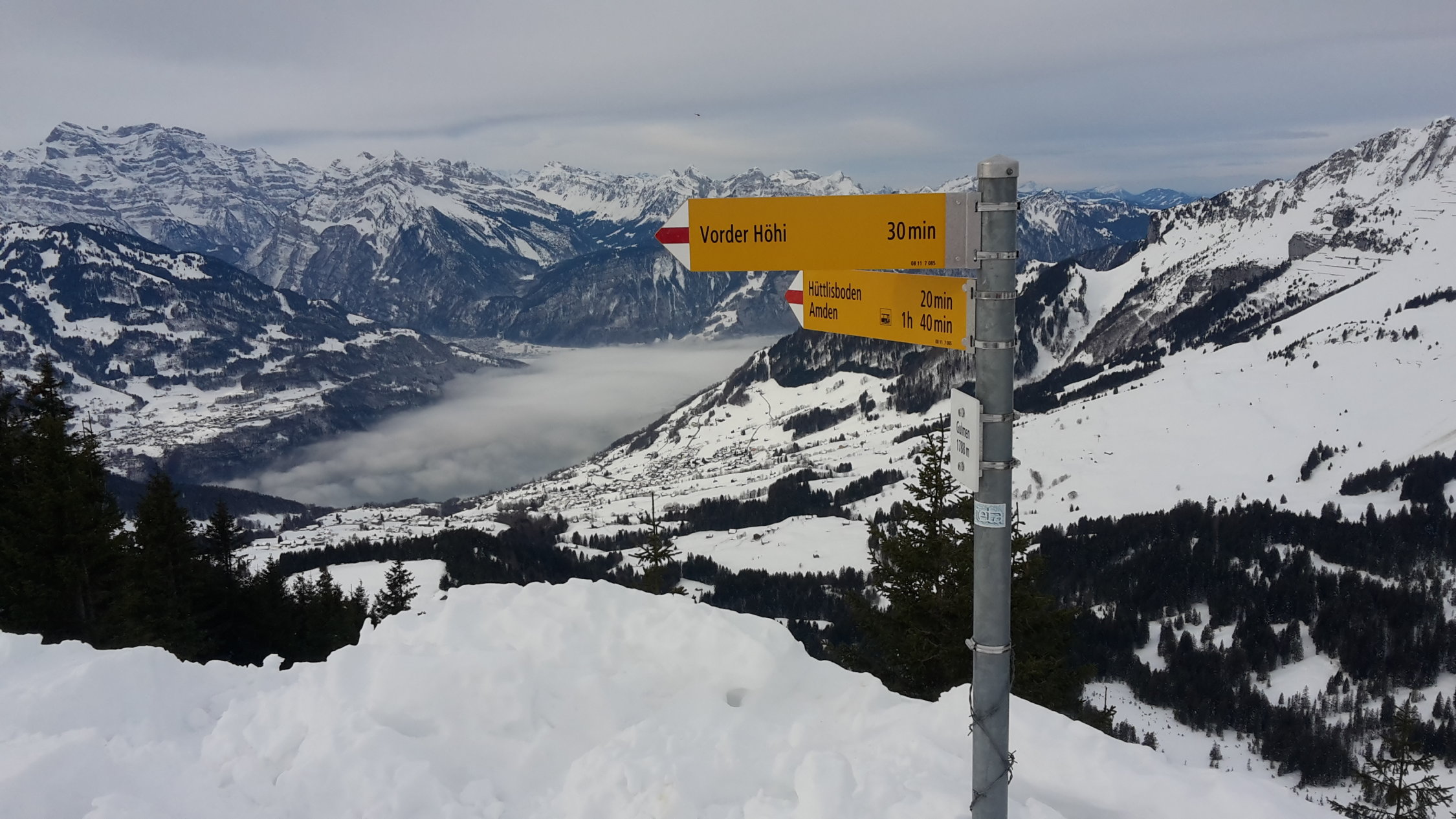 Von Stein Gemeindehaus-Eggli, 910, orographisch links - P.1455 (Route 811c), Schönenboden Ost - bei Vorder Höhi nach rechts kurz steil auf Ostrücken, dann sanft zum Gipfel. Lohnende Steilabfahrt via Hüttlisboden, dann abflachend nach Amden