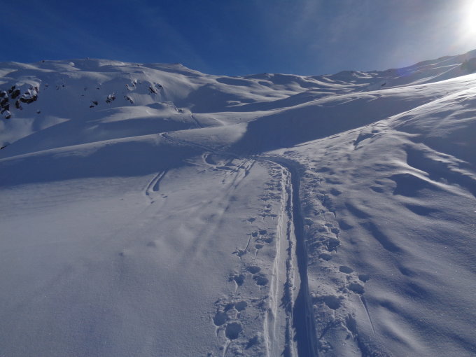 In der Nacht hat es nur wenige cm geschneit. Im Wald im Aufstieg wenige harte Stellen, sonst wunderbar Stimmungen. Am Brudelhorn grosse Schneefahnen. Auf dem Gipfel leichter Wind. Abfahrt über dem Wald kaum Spuren (die meisten sind nach Ulrichen abgefahren). Teilweise etwas unregelmässiger Schnee unter dem wenige Neuschnee (Windharst), aber meist gut fahrbarer Presspulver. Im Wald dann problemloser Pulver. Und am Schluss wunderschön bis aufs Bahnperron der MGB fahren in Geschinen...