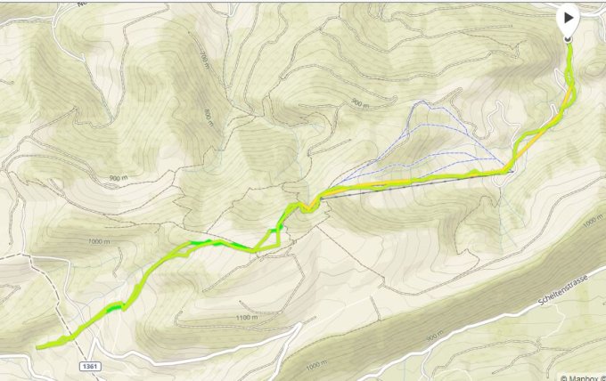 Ich bin vom Gipfel noch ca. 400m nach Südwesten zur Scheltenstrasse abgefahren (siehe Karte in Bildern). Die ersten Schwünge tragender Deckel, der aber zunehmend einbrach, mal in Pressschnee, weiter unten in Weichschnee. Jeder Schwung absolut nicht berechenbar. Nur die letzten 100m vor der Scheltenstrasse waren schön zu fahren, da komplett aufgefirnt.