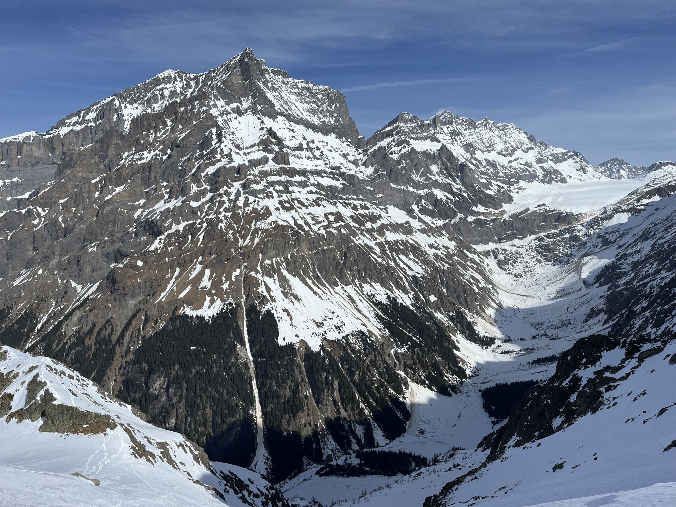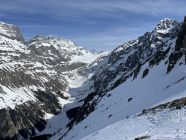 Zu Fuss ab Eggeschwand in etwa 1.30 nach Selden, bis hier meist tragend. Weiterhin tragend bis Gfelalp und etwa 2100 m. Danach Variante b gewählt, Schnee wechselhaft: Abschnitte mit Pulver oder Bruchharsch. Oberster Abschnitt (Couloir) ziemliche Wühlerei in Zuckerschnee.