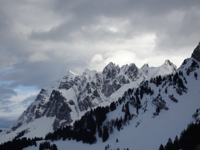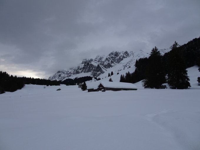 Von Beginn weg mit Schneeschuhen auf guter breiter und sehr gut tragender Spur. Vom Riet weg bis zum Risipass ca. 20 cm eingeblasener Schnee auf der Spur. Aufstieg Waldschneise ziemlich vereist (für Skitourengeher evtl. besser mit Harscheisen).