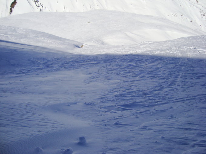 Die ganze Tour ist ab Höhe Vorder Schweig stark windgeprägt. Dementsprechend ist das Gelände von Zastrugis, Winddeckel und Triebschneeverfrachtungen gezeichnet. Letztere machten den Höhengewinn teilweise recht anstrengend, da sich dieser mit Vorliebe, in der eigentlich gut gelegten Spur ablagerte.