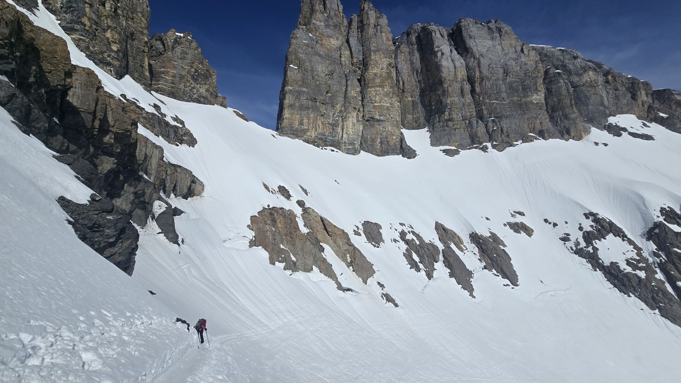 Perfekte Sulzbedingungen. Diese Tour ist einfach optimal bei den jetzigen Bedingungen, weil oben die Südhänge früh aufsulzen, weiter unten dreht das Gelände auf West, d.h. die Sonneneinstrahlung kommt später. Abfahrt beim Skidepot um ca 13 Uhr war gerade noch gut. Dank Schleierwolken und Staub war auch die Sonne heute weniger stark.
